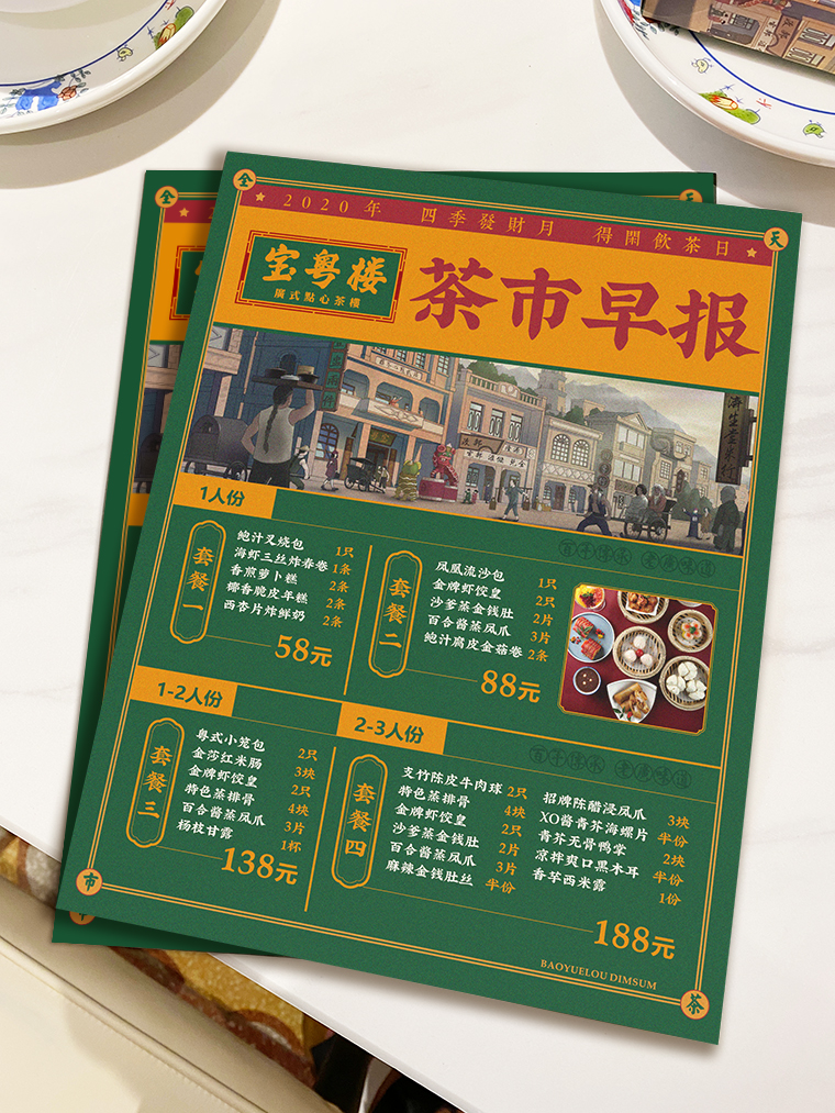 寶粵樓:百年傳承的老廣味道,點(diǎn)心單除了具備點(diǎn)餐的功能,還應(yīng)表達(dá)品牌歷史和底蘊(yùn)。寶粵樓的茶樓市井氣息濃厚,點(diǎn)心單只選取部分產(chǎn)品圖片,刻意傳達(dá)一種古舊的老茶樓氣息;茶市早報(bào)的創(chuàng)意設(shè)計(jì),則將老廣人嘆早茶,看報(bào)紙的生活場(chǎng)景再次還原,極有趣味性之余更把品牌帶入歷史年代中。
