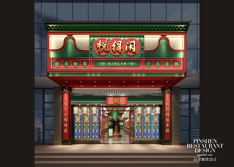 8、門頭形象:門頭是品牌的臉面,也是顧客接觸我們的第一個場景。門頭形象具有廣而告之的作用,門頭代表著餐廳的名字叫什么,賣的產品是什么,這是最基本且不可或缺的要素。門頭完全可以作為全方位展示店特色的工具,巧妙的組合可用信息向客戶發送品牌信息,從而引發客戶興趣。悅得閑廣式點心茶樓的門頭大量使用鑊耳山墻,讓廣式茶樓的特性展露無遺。