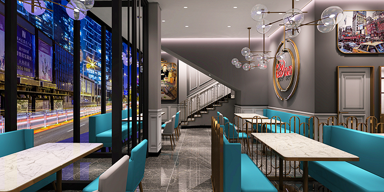 港灣茶餐廳內部裝飾盡量簡潔為主,沒有繁復的線條,整裝護墻板采用高級灰,時尚感強,藍綠色的招牌外觀,純鐵藝格柵,金色鍍銅架,整體氛圍休閑時尚,富有網紅特質。
