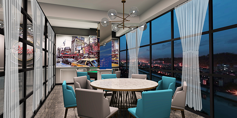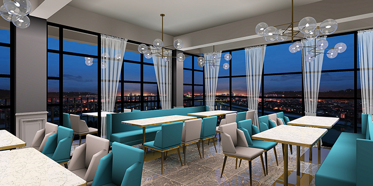 港灣茶餐廳空間裝飾裝修設計圍繞“時尚、休閑、放松”為設計哲學,將原來餐廳建筑物的外墻全部打掉,形成大面積落地幕墻玻璃,視覺通透,明亮純凈,周邊路過的顧客紛紛駐足停留,拍照打卡。